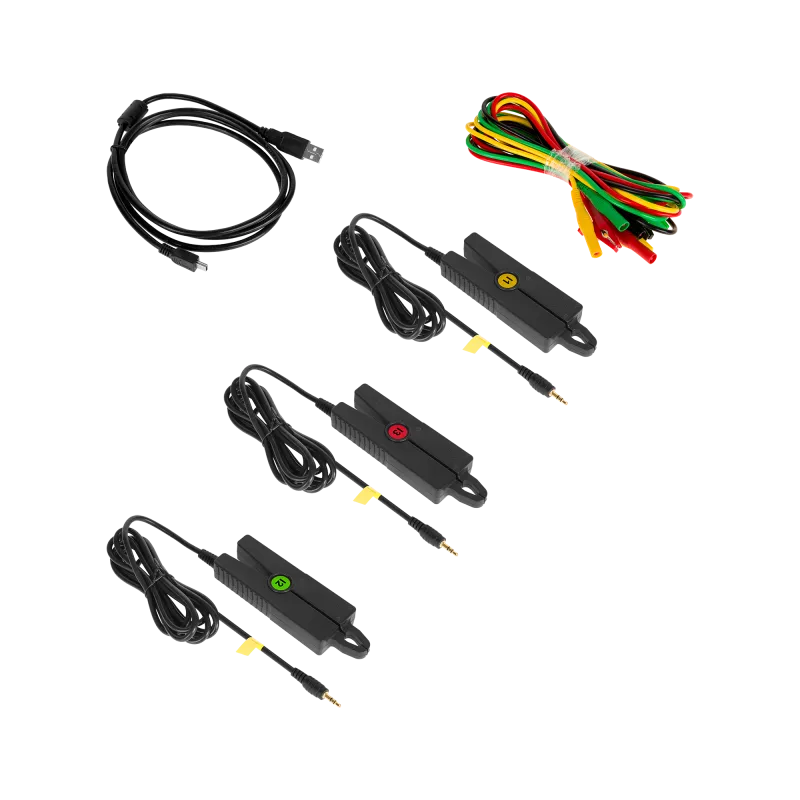 batéria, prúdové kliešte (3ks), testovacie vodiče (1 žltý, 1 zelený, 1 červený, 1 čierny)