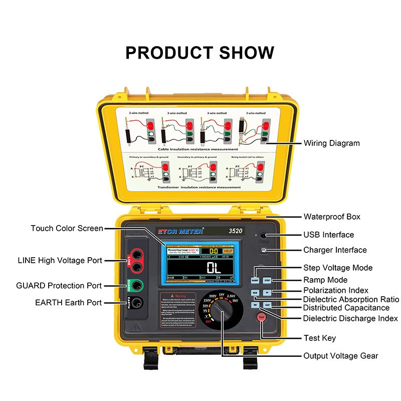 ETCR 3520 - Tester izolácie 5kV, 10TOhm, 7mA Prístroje rady ETCR 3520 ponúkajú množstvo testovacích funkcií, vyznačujú sa vynikajúcou odolnosťou proti rušeniu.