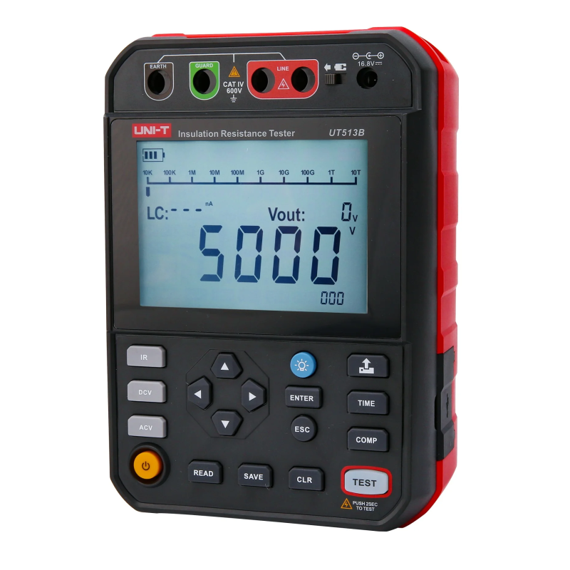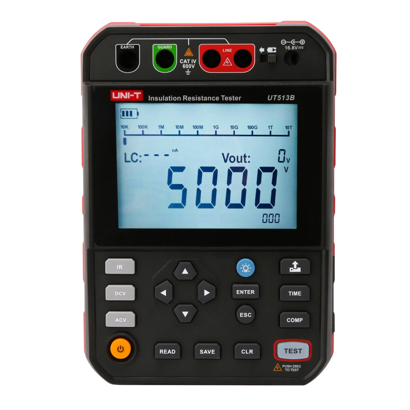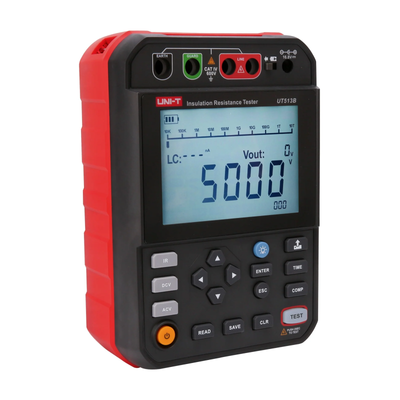 Tester izolačného odporu UT513B 5 kV, je digitálny vysokonapäťový tester izolačného odporu, navrhnutý s niekoľkými rozsahmi vrátane 250 V, 500 V, 1000 V, 2500 V a 5000 V. Je ideálnym meracím prístrojom pre oddelenie elektrickej energie, telekomunikácií, meteorológie, strojovne, elektromechanické inštalácie a údržby.
