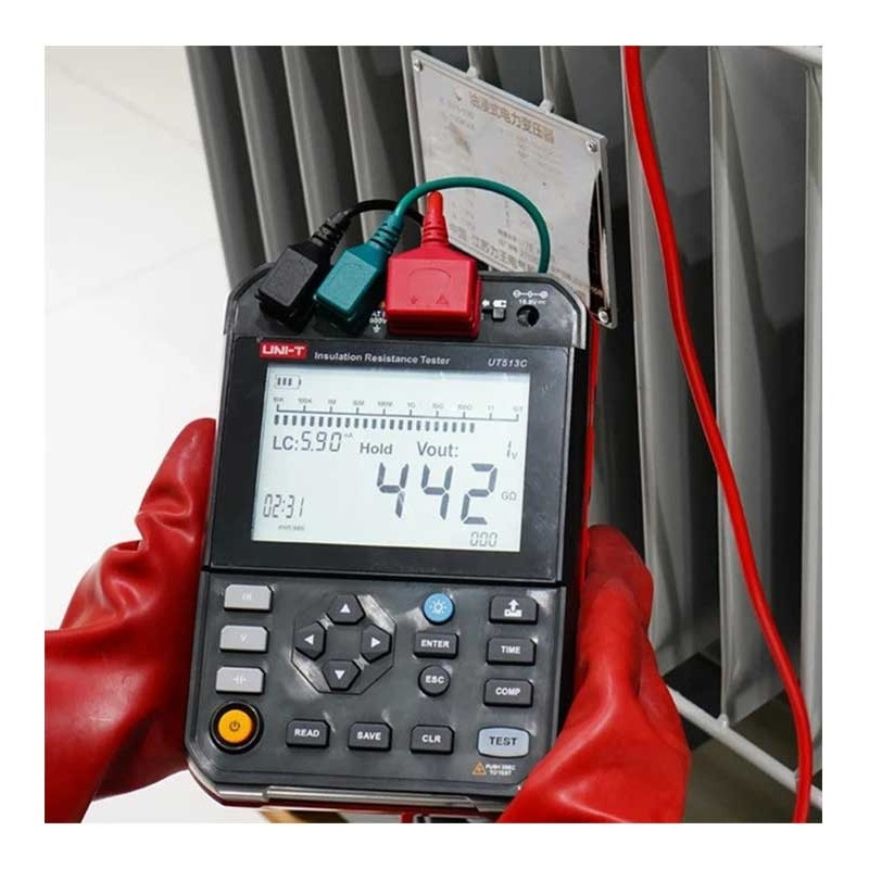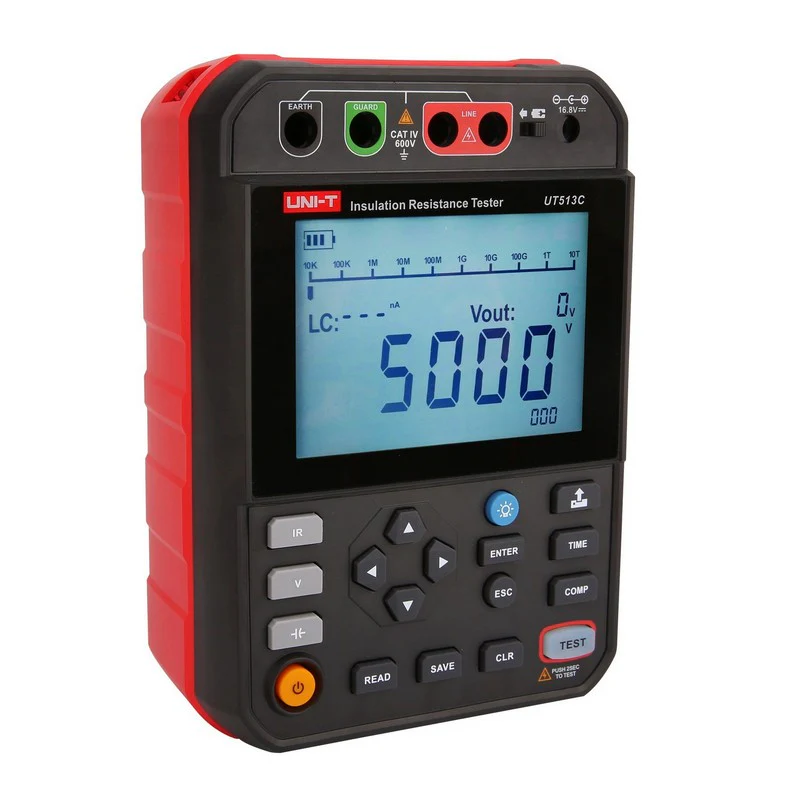 Tester izolačného odporu UT513C 5 kV, je digitálny vysokonapäťový tester izolačného odporu, navrhnutý s niekoľkými rozsahmi vrátane 250 V, 500 V, 1000 V, 2500 V a 5000V. Je ideálnym meracím prístrojom na oddelenie elektrickej energie, telekomunikácií, meteorológie, strojovne, elektromechanickej inštalácie a údržby.