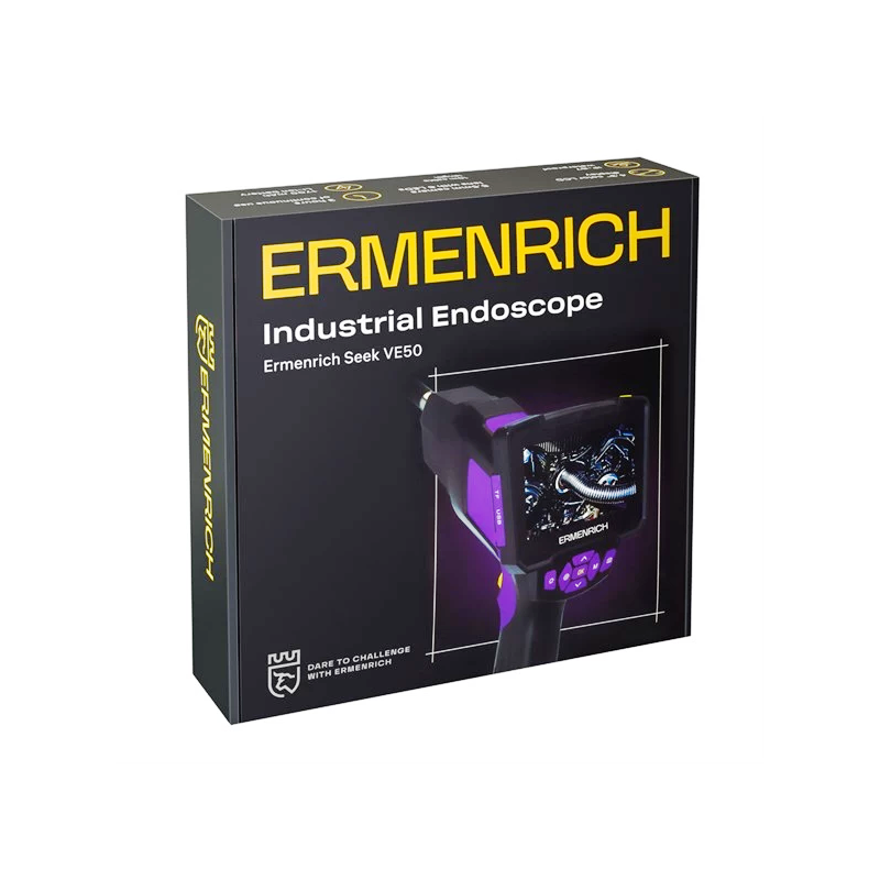 Ermenrich Seek VE50 je priemyselný endoskop (boroskop) s 5,5 mm HD kamerou, ktorá poskytuje 70° uhol pohľadu. S týmto prístrojom je možné vďaka flexibilnému husaciemu krku s dĺžkou 10 metrov ľahko kontrolovať všetky ťažko prístupné miesta.