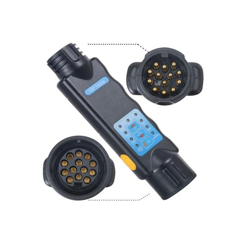 Praktický tester 13 pólových zásuviek aj vidlíc prívesných vozíkov, karavanov aj ťažných vozidiel. Napájanie 12V.