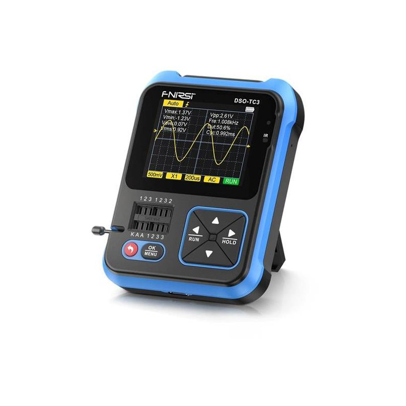 Osciloskop 500kHz, generátor funkcií a tester súčiastok FNIRSI DSO-TC3, je kompaktný digitálny osciloskop s niekoľkými funkciami: