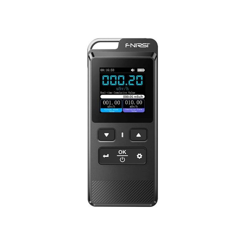 Detektor žiarenia, dozimeter FNIRSI GC-02. FNIRSI GC-02 je detektor jadrového žiarenia s elegantným dizajnom a kompaktnými rozmermi. Na detekciu ionizujúceho žiarenia vrátane gama žiarenia, beta žiarenia a röntgenového žiarenia používa Geiger-Müllerovu trubicu. Zariadenie je vybavené 1,5-palcovým displejom IPS LCD s vysokým rozlíšením, ktorý ponúka prehľadné a prehľadné rozhranie a na prvý pohľad zobrazuje hodnoty v reálnom čase, priemerné, maximálne a kumulatívne hodnoty. Používatelia môžu konfigurovať prahové hodnoty alarmu, nastaviť časy spánku a vypnutia a prepínať medzi ôsmimi jazykmi. Medzi ďalšie funkcie patrí režim časového monitorovania a zobrazenie histórie, ktoré zaznamenáva až 10 meraní v nevolatilnej pamäti, ktoré sa zachovajú aj po vypnutí zariadenia. GC-02 je napájaný dobíjateľnou lítiovou batériou.