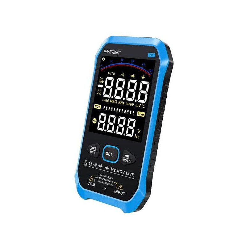 Digitálny multimeter FNIRSI S1 s automatickým rozsahom 8v1 sa vyznačuje vysokou presnosťou, rozsiahlymi meracími funkciami, veľkým podsvieteným displejom. Multimetru dominuje veľký prehľadný displej, pod ktorým sa nachádzajú len 3 tlačidlá, ktoré slúžia na prepínanie meraného parametra, na zapnutie merania NCV, na podržanie zobrazenia meranej hodnoty alebo zadnej kontrolky. Multimeter FNIRSI S1 nepotrebuje žiadne ďalšie tlačidlá, pretože využíva automatický rozsah merania. Stačí pripojiť meracie hroty v spodnej časti a pomocou tlačidla SEL nastaviť, čo chcete merať. Digitálny multimeter FNIRSI S1 je univerzálny multimeter, s ktorým môžete merať nielen odpor, striedavé/stále napätie, kapacitu, ale určite využijete aj bezkontaktné testovanie napätia NCV, káblový meter s bzučiakom, môžete merať aj teplotu kvapalín. Jednoduché ovládanie a ľahko čitateľný displej: Vďaka veľkému, ľahko čitateľnému LCD displeju a intuitívnemu rozhraniu sa digitálny multimeter FNIRSI S1 ľahko používa. Podsvietený displej zaručuje vynikajúcu čitateľnosť aj v zle osvetlených podmienkach.