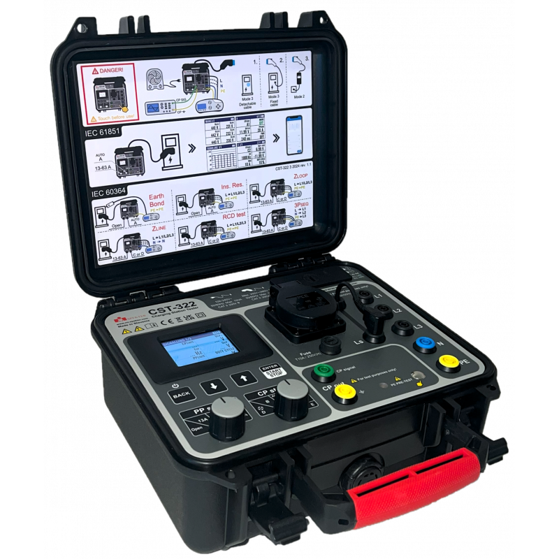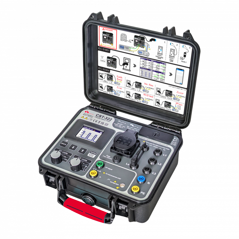 Prístroj je navrhnutý podľa IEC/EN 61851‑1 a IEC/HD 60364‑7‑722, ideálny pre servis, údržbu a kontrolu dobíjacích staníc.