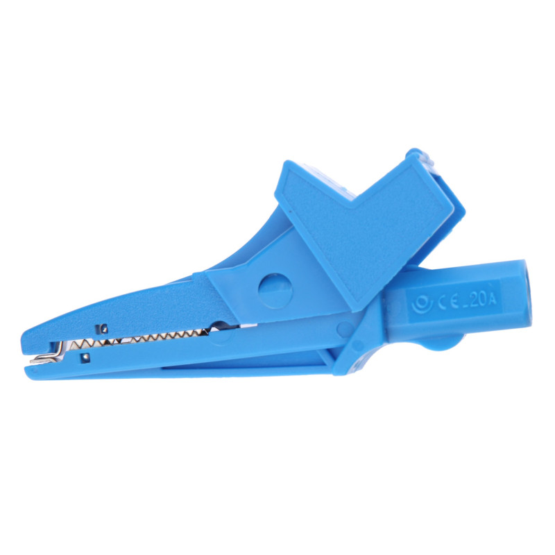 K-02 krokosvorka modrá - bezpečné, izolované krokosvorky so zásuvkou Ø 4 mm, určené na pripojenie meracích vodičov so zástrčkami a ochranným prvkom. Majú veľký rozsah otvorenia, čo umožňuje ich pripojenie na vodiče s priemerom až 16 mm. Okrem zúbkovaného povrchu majú aj ploché časti na uchopenie malých predmetov. Sú dostupné vo viacerých farbách. Uvedený model je modrý s maximálnym pracovným prúdom 20 A.